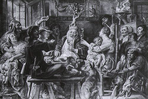 "Jacob Jordaens recorded the festivities of 6 January in several large canvases. For hisdepictions he invariably chose the moment when the king starts the party by takingthe first sip. Jordaens located his festivities in opulently furnished interiors. Thispreliminary drawing was intended for the engraver Paulus Pontius, who produced aprint of the scene."