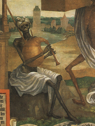 Once called Reval, Tallinn is now the capital of Estonia. There, in the St Nicolas' Church, lovers of the arts can admire a dance of death by Bernt Notke, who also executed a similar one in LŸbeck. Tallinn's canvas goes back to the last quarter of the 15th century. The dance begins with a preacher standing on a pulpit. At his side, a dead one sitting on a big stone plays the bagpipe. Carrying a coffin, another corpse leads the pope to his own death. Then come the emperor, the empress, the cardinal and the king (in the same order as in LŸbeck's dance of death). The last figure, a dead one, stands alone. The living one he was once paired up with has disappeared, as well as other scenes of the original dance of death. All of the following information was obtained very generously through Patrick Pollefeys website on the Dance of Death. Please click the link and let him know that we appreciate it.