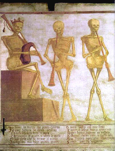 The fifteenth century church of San Vigilio, near the cemetery of Pinzolo, was frescoed in 1539 by Simone Baschenis who created a celebrated "Dance macabre" here, with saints and the cardinal sins, and a somber inscription referring to death triumphant, "io sont la morte che porto corona..."
