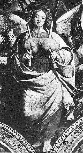 Gaudenzio Ferrari detail of angel playing a bagpipe with two one-hand chanters and two drones. Santuario, Saronno 1535