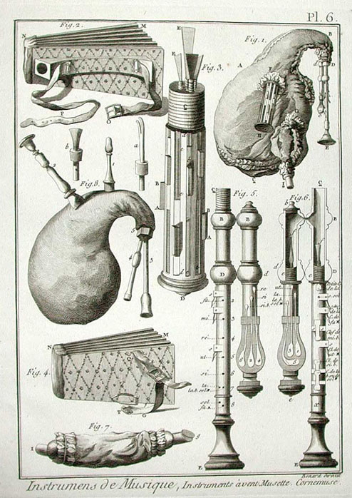 depicting a bellows blown bagpipe, a mouth blown bagpipe and various accoutremonts