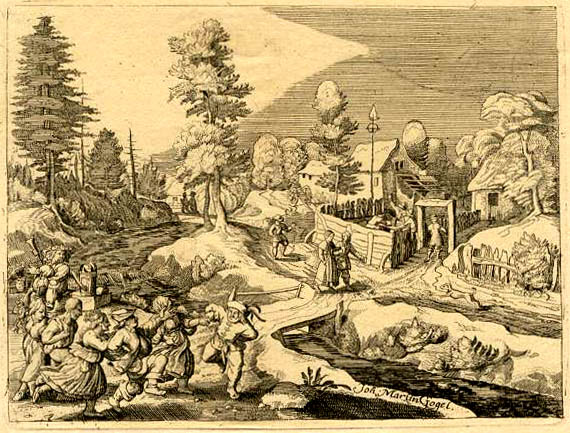 "In the "Stammbuch" (kind of student's album) of Johann Michael Weckherlin (17 th century) there is a coloured version of it, in reverse (Stuttgart, WŸrttembergische Landesbibliothek). The dancers and the piper however are copied from Hans Holbein, from a fresco on a house in Basel, Switzerland, the house being called "House to the peasant dance"Thanks to Ernst Schmidt for the information