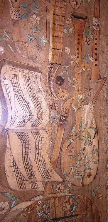 Table, "Chance and Harmony"Hardwick Hall, Derbyshire, 16th c. I'll have to let Sean talk about this in his own words. Hardwick Hall, near Chesterfield in Derbyshire,UK The woman who had the Hall built was called Tess of Hardwick, and having married well 4 times, with I think, 3 husbands dying on her, was worth a fortune. She became very influential and had the 'whole' house covered in tapestries and embroideries. It's an amazing place! I kept my eye out for the odd roaming bagpiper and eventually found the tapestry in the 'Blue Room' (a state room) hidden behind a chair! The state rooms were built to hopefully house Queen Elizabeth 1, but she never came to stay. The tapestries are mostly all 16th century Flemish ones. The table was another amazing find. I started at one side and it wasn't until I got right the way round that I came across this - I nearly missed it too! It was made to commorate the marriage of Bess to the Earle of Shewsbury and also the marriage of 2 of Bess's children to 2 children of the earle. the games on one side of the table represent chance and the music side representing harmony, so the table dates back to the 16th century, late 1500s!